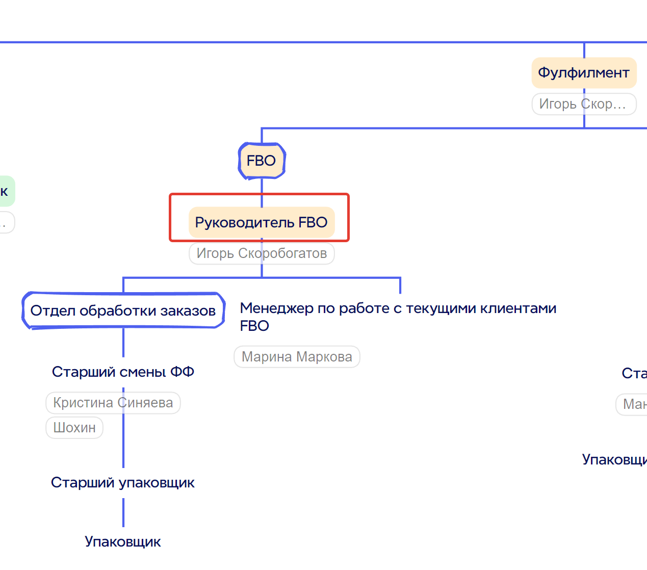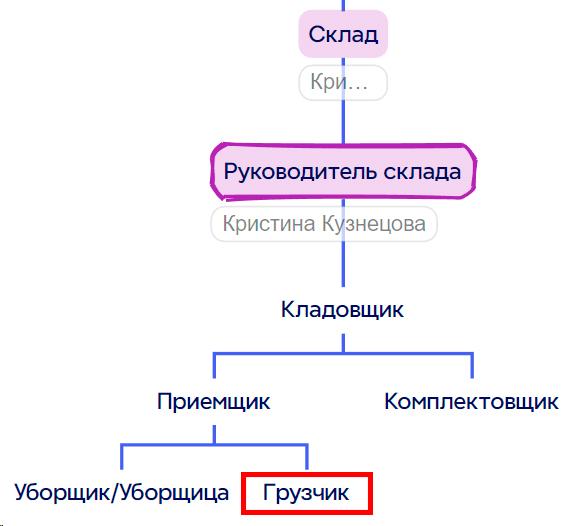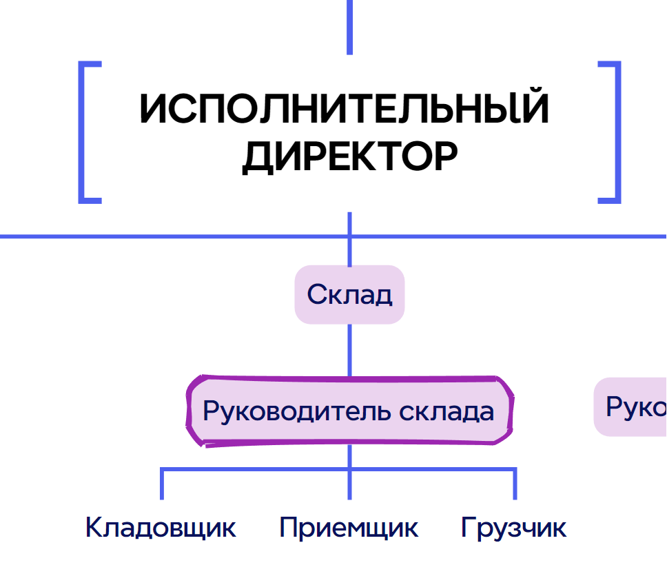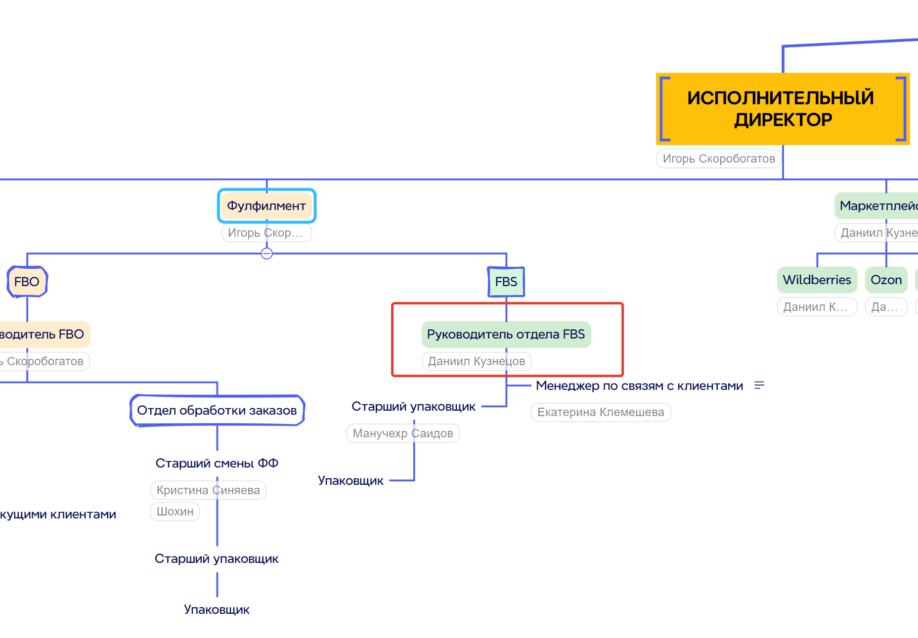 4. Положение на организационной схеме: Находится на самом верхнем уровне организационной структуры компании, руководит всеми подразделениями: Фулфилмент, Склад, Логистика, IT, Финансы, HR, Отдел маркетинга, Отдел снабжения, Отдел СТМ и другими подразделениями.