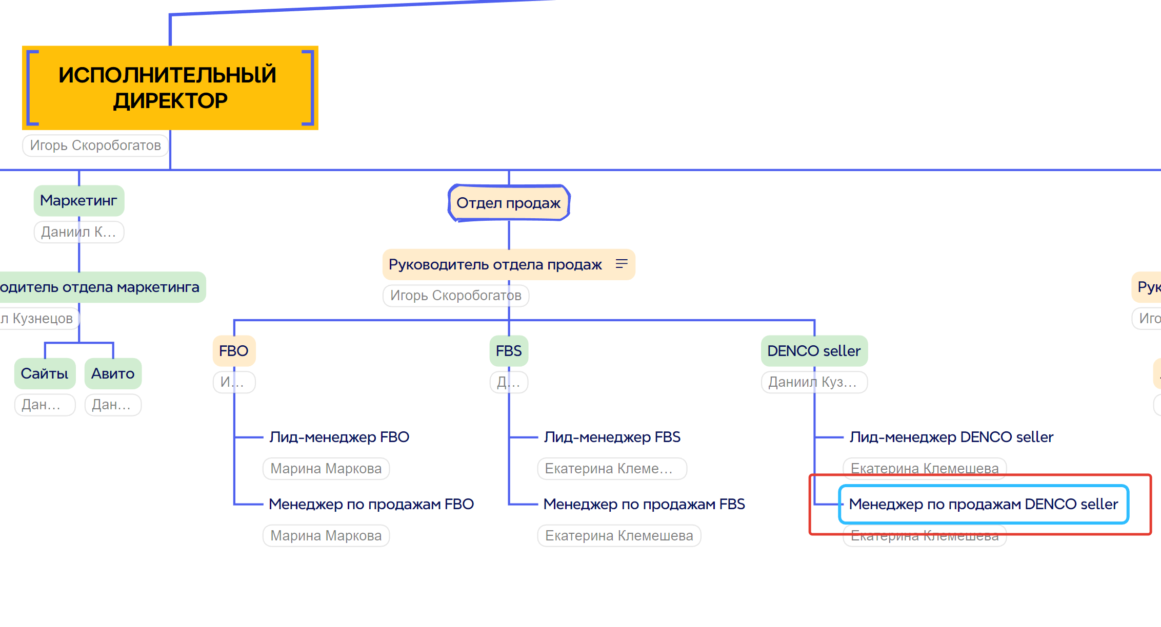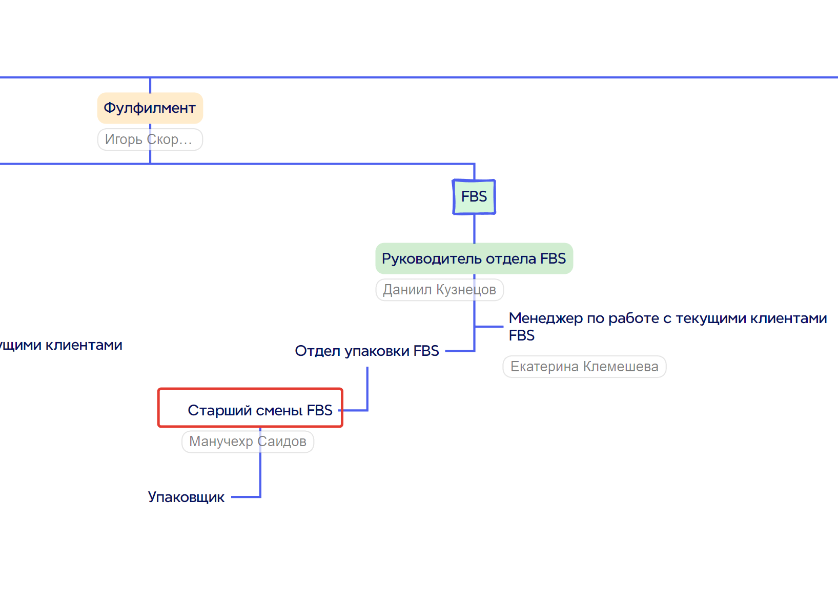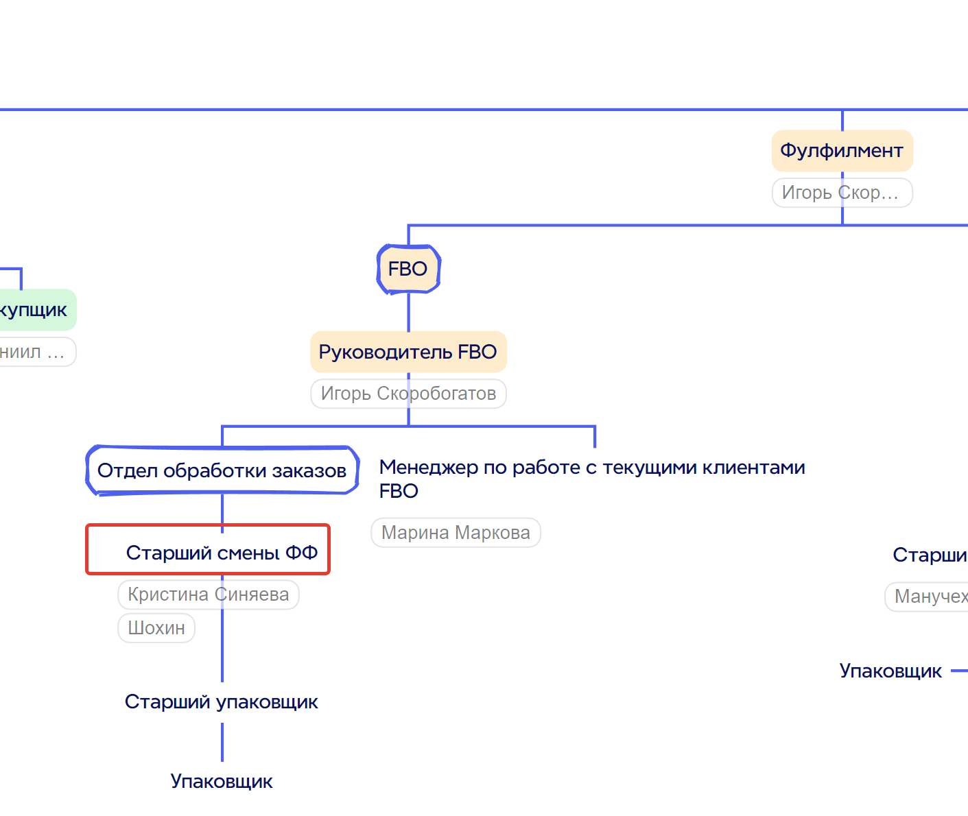4. Положение на организационной схеме: Находится на самом верхнем уровне организационной структуры компании, руководит всеми подразделениями: Фулфилмент, Склад, Логистика, IT, Финансы, HR, Отдел маркетинга, Отдел снабжения, Отдел СТМ и другими подразделениями.